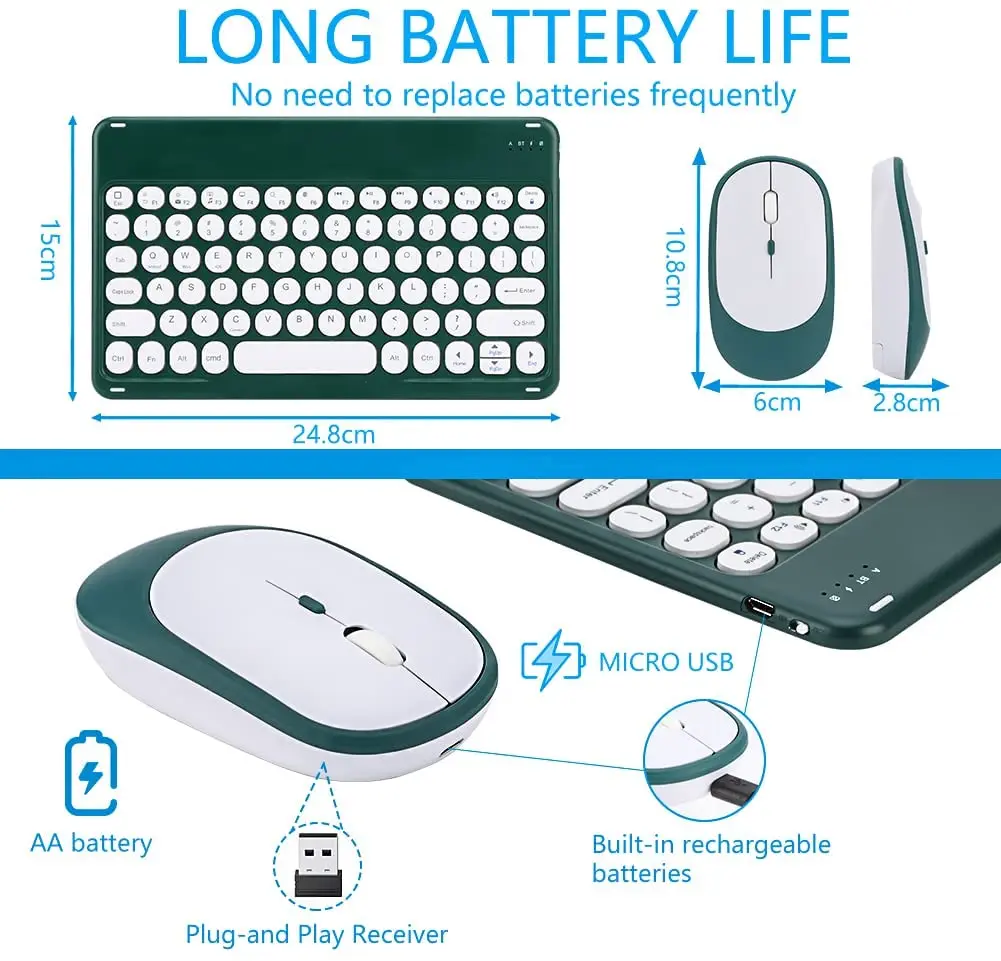 Универсальная беспроводная bluetooth-клавиатура использует встроенный литиевый аккумулятор, его можно легко заряжать через usb-кабель, не нужно менять аккумулятор. Встроенная перезаряжаемая батарея невероятно долговечна, время работы в режиме ожидания составляет около 6 месяцев между зарядами. Беспроводная клавиатура bluetooth может автоматически войти в режим сна для экономии энергии.