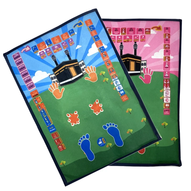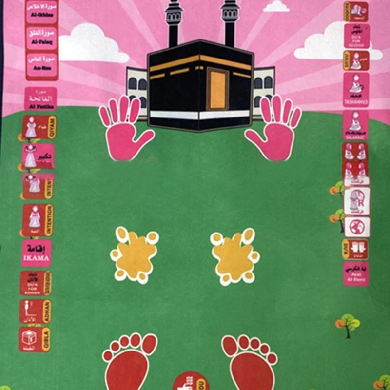 Интерактивный молитвенный коврик чувствителен к прикосновениям и имеет Предварительно записанные ключи, которые могут быть тронуты, чтобы показать звук, например, время молитвы, как делать wudu, читать сурахи, сказать duas, И многое другое.