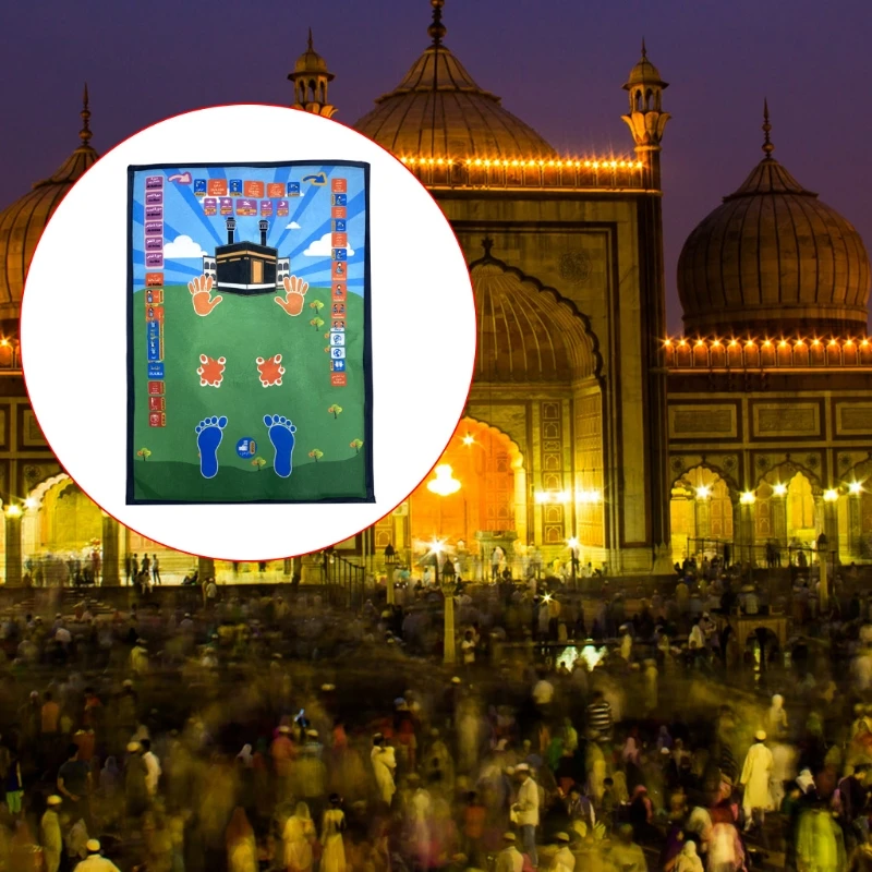 Это молитвенный коврик, предназначенный для обучения детей тому, как выполнять мусульманскую молитву веселым и приятным способом.