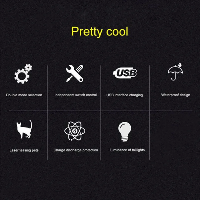Особенности: мульти-режимы, независимое управление переключателем, зарядка через usb-интерфейс, водонепроницаемый дизайн, лазерная подзарядка домашних животных, защита от разряда, высокая яркость.