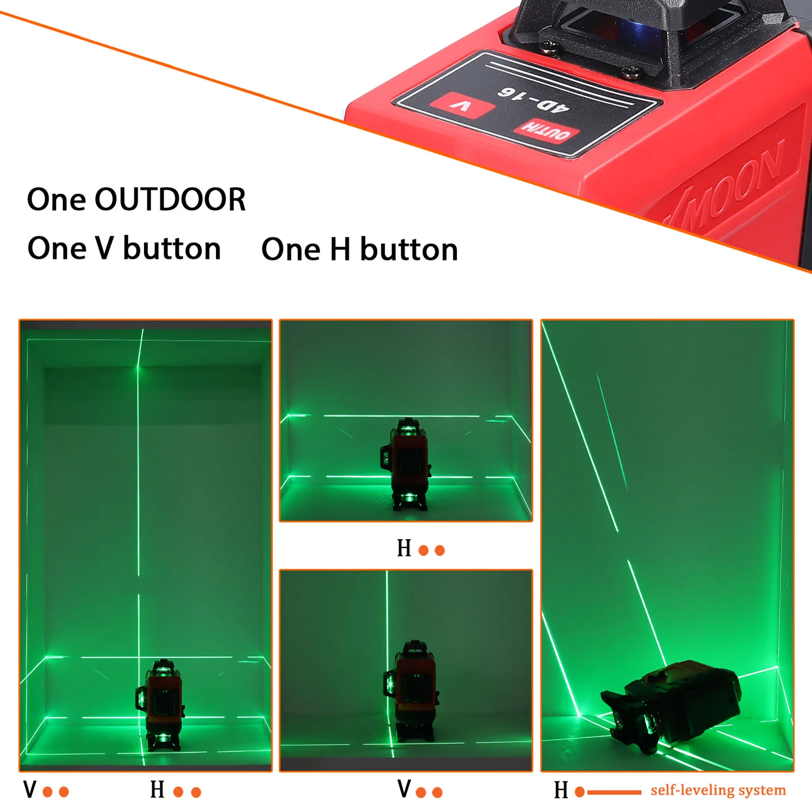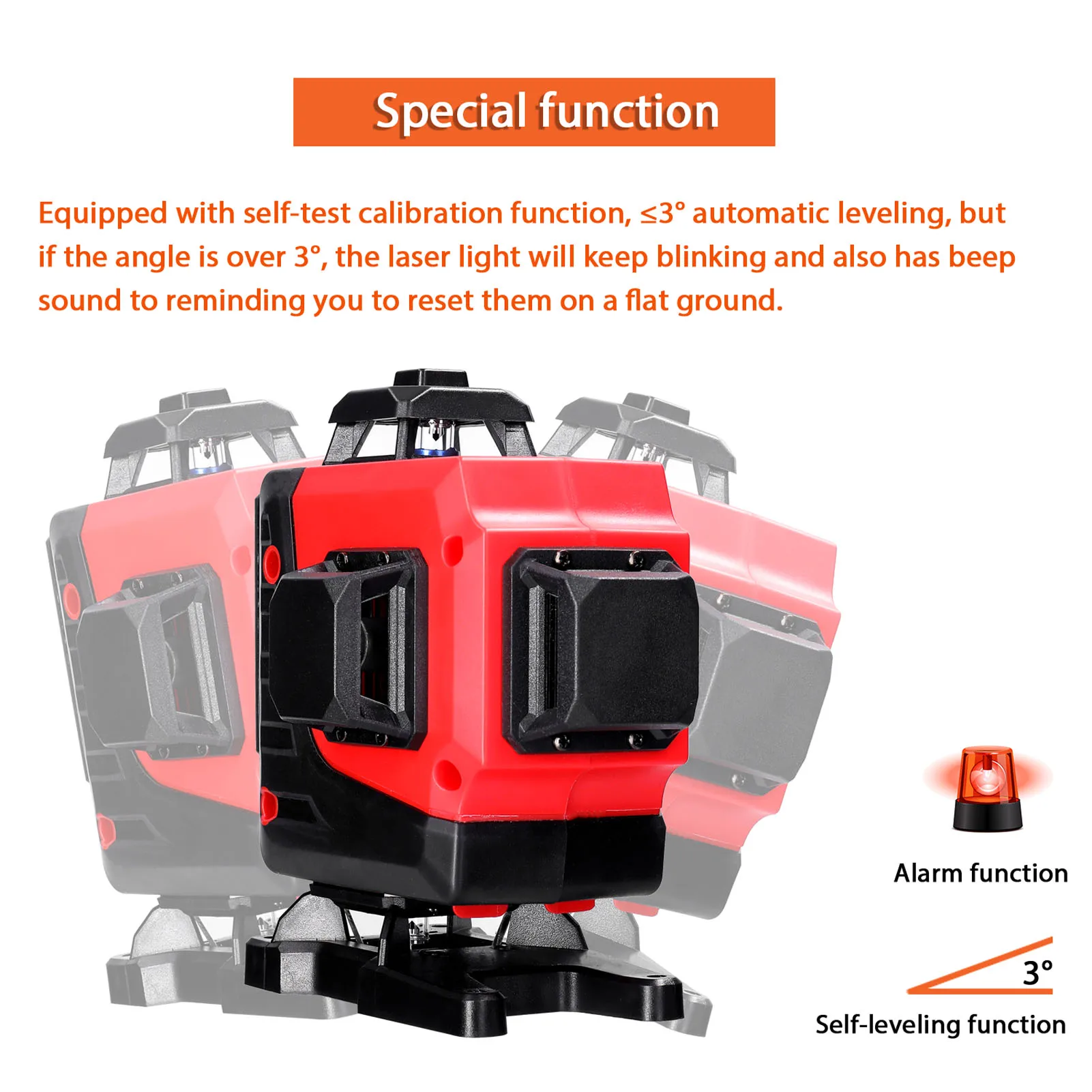 Оснащен функцией самостоятельной калибровки, ≤ 3 ° автоматическое выравнивание, но если угол превышает 3 °, лазерный светильник будет продолжать мигать, а также имеет звуковой сигнал, чтобы напомнить вам, чтобы сбросить их на ровную поверхность.