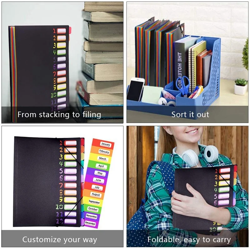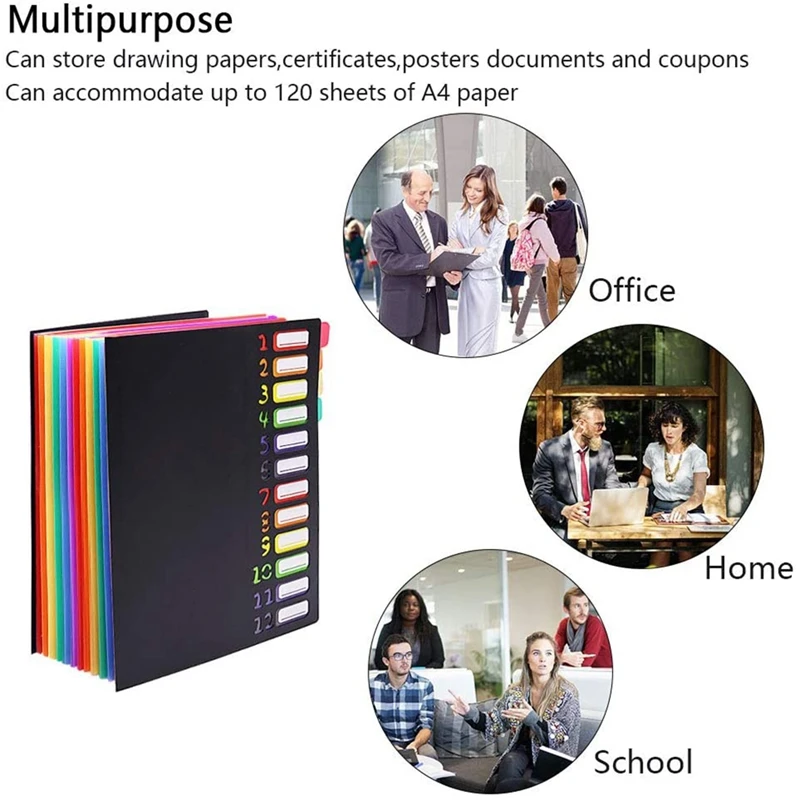 Расширяемый и легкий доступ: эта расширяемая папка для файлов помогает сэкономить больше места в вашем многолюдном столе; В общей сложности 12 разделителей для 12 карманов в папке. В отличие от других файловых папок, эта папка с колонкой из 12 разных тапочек сбоку облегчает получение файлов.