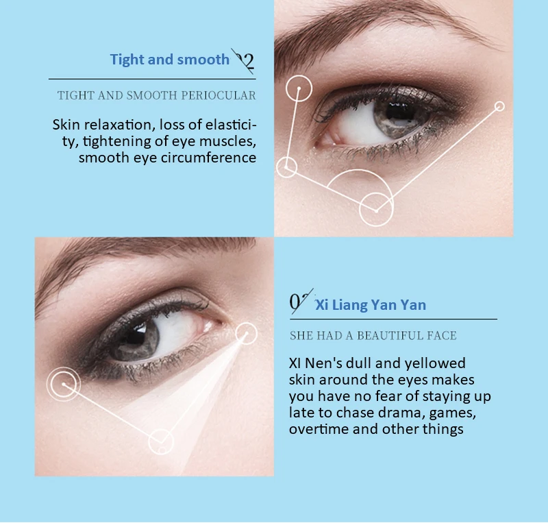 Увлажняющий и увлажняющий, он может эффективно и в полной мере обеспечить достаточную влагу для кожи глаз и восполнять недостаток влаги, увлажнить кожу глаз.