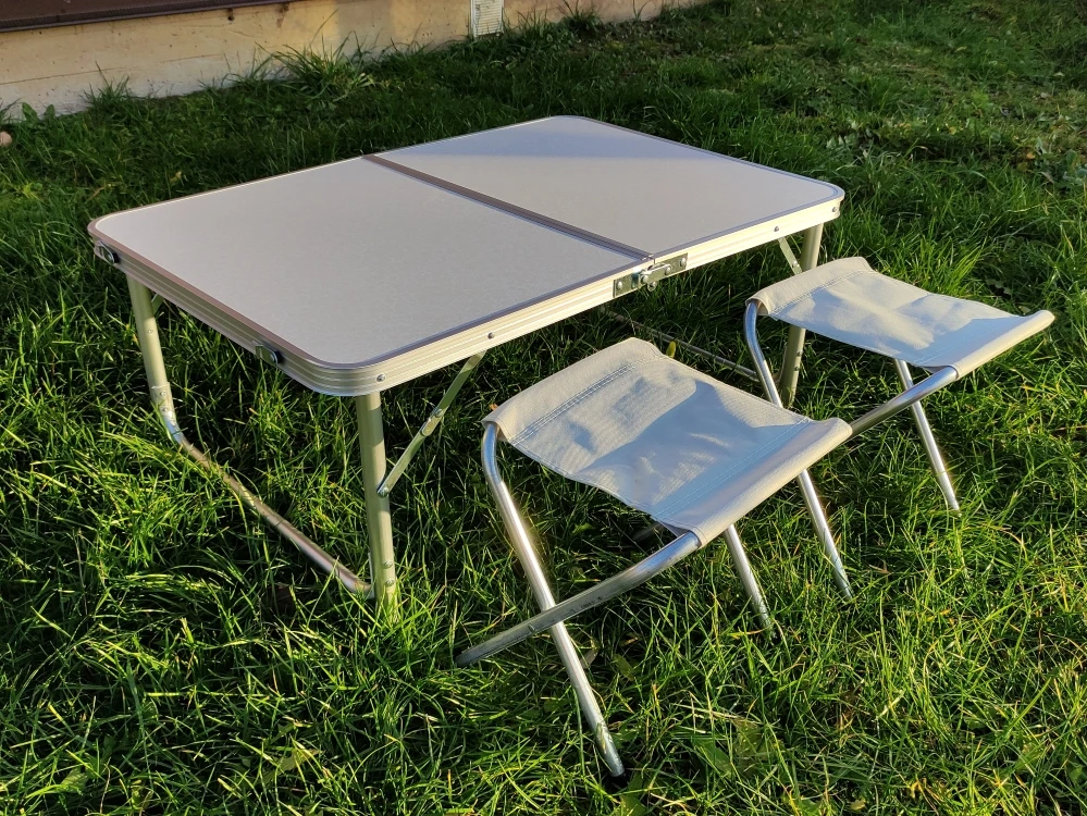 Лёгкий раскладной стол и 2 раскладных стула в комплекте.