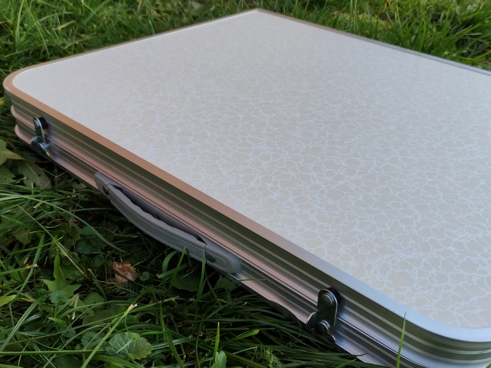 Туристический стол складывается в удобный чемодан для переноски. Каркас изготовлен из алюминиевого сплава. Столешница стола гладкая, с закругленными углами, с окантовкой по периметру.