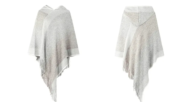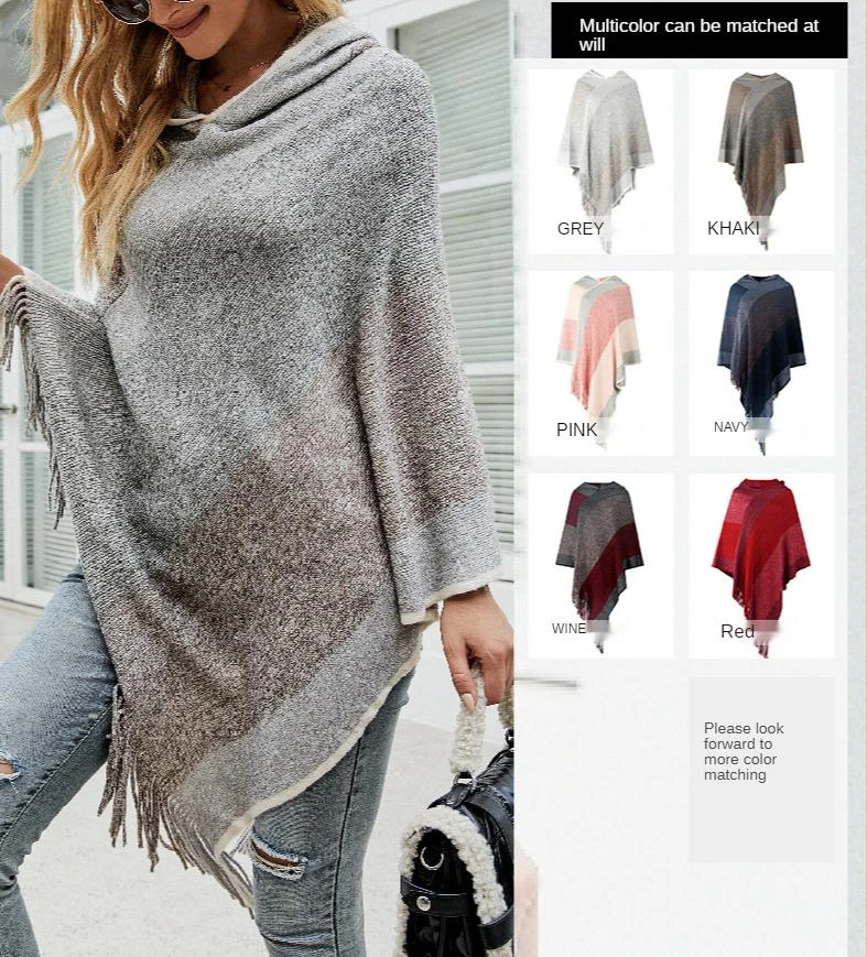 Зимнее пончо для женщин в полоску контрастного цвета с капюшоном, накидка, вязаная шаль с асимметричным подолом, пальто с кисточками, цветной блок, вязаный пуловер