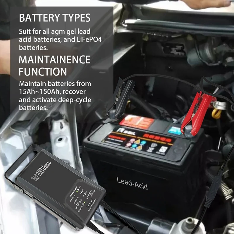[Automotive Battery Charger] Automatic monitoring charging process, fully discharged batteries lead acid charge mode, 72-hour safety charging protection, pulse function activates the battery