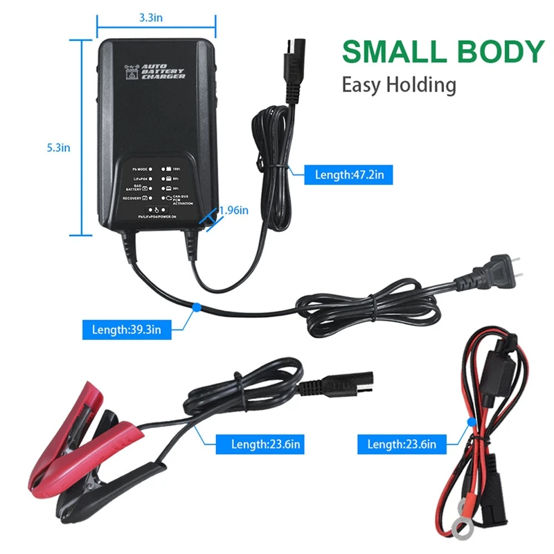 [Polarity Protection] Battery maintainer charger automotive prevents the output leads from sparking due to accidental reverse connection or short circuit, making the charger safer to use around batteries.