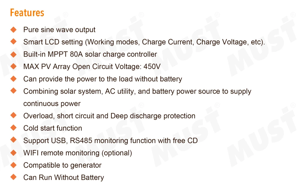 PH1800PRO-это многофункциональный инвертор/зарядное устройство, сочетающее функции инвертора, солнечного зарядного устройства MPPT и зарядного устройства для обеспечения бесперебойного питания в портативном размере. Серия PV1800 PRO может работать без аккумулятора. Максимальное PV напряжение цепи может достигать 450V и MPPT напряжение 150 ~ 430Vdc, что может помочь клиентам в полной мере использовать солнечную энергию.