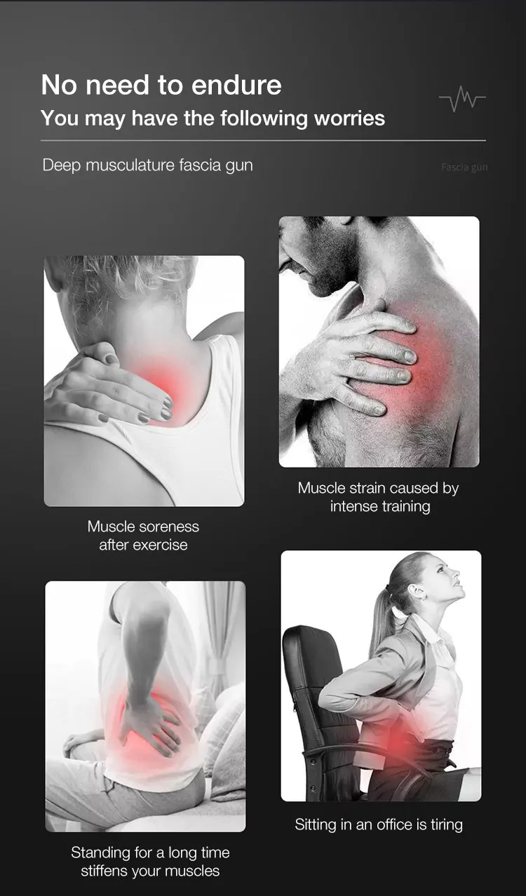 Физические упражнения или Плохая осанка могут привести к разрушению фасции и мышц, что приводит к «задержке болезненности мышц», что приводит к жестким и болезненным мышцам. Пистолет Fascia может уменьшить адгезию и конкрецию между мышцами и фасцией путем высокочастотной вибрационной стимуляции и предотвратить спортивные травмы.