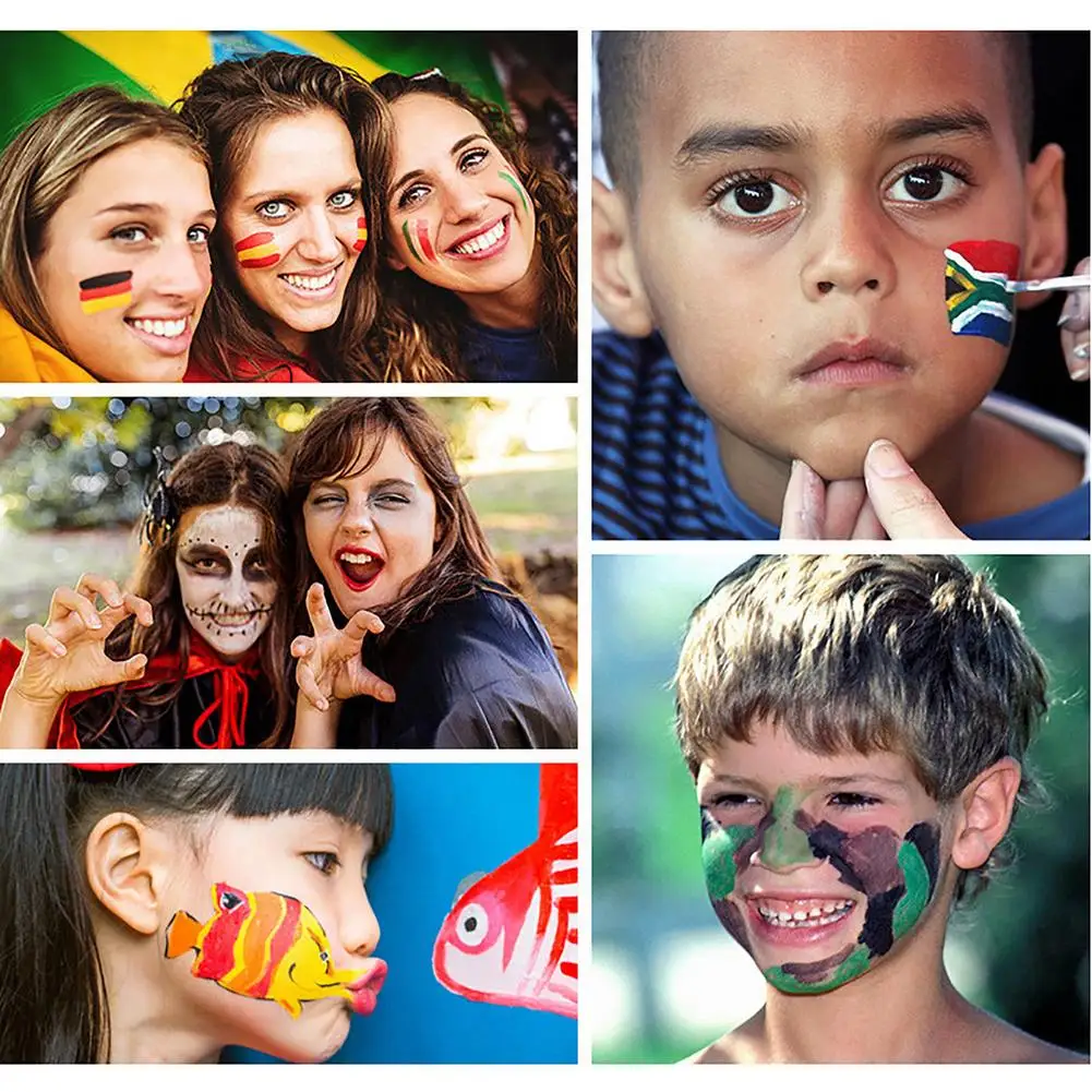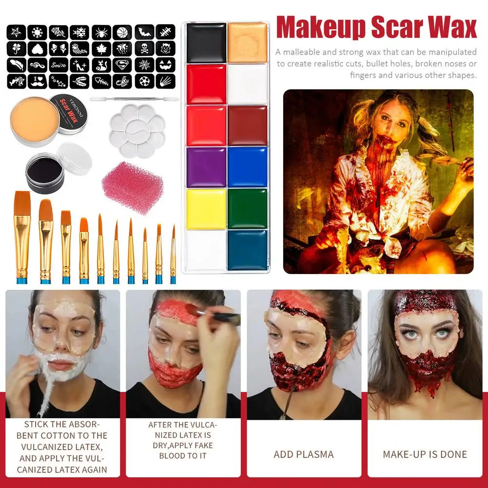 4. Посылка включает в себя: 32 шаблонов. Макияж воск для шрамов 60 грамм, шпатель инструмент, плазма 30 мл, кисть для инструментов 10, губка, краска для тела (12 цветов), лоток для краски.