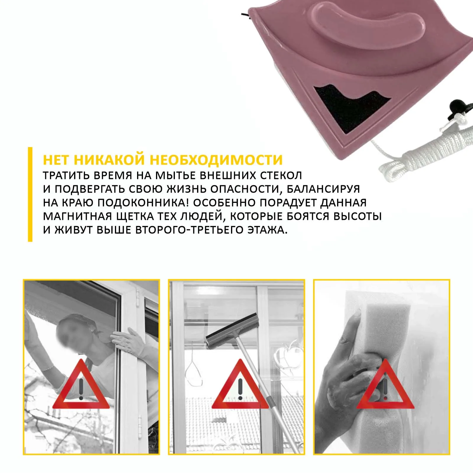 Качественное и безопасное мытье окон в 2 раза быстрее. Одновременно моет, вытирает и полирует стеклянную поверхность окна. Щетка имеет уникальную конструкцию, состоящую из двух частей, соединяющихся между собой на стекле с помощью мощных магнитов. Вы держите в руках одну щетку со специальной анатомической ручкой, и водите ею по внутренней поверхности стекла. Вторая щетка, закрепленная снаружи, повторяет ваши движения, благодаря магниту, встроенному внутри. Теперь не нужно высовываться по пояс из окна, пытаясь достать все углы. Щетка на магнитах это делает за вас! А чтобы предотвратить случайное падение внешней щетки, она оборудована специальным шнуром длиной 70 см с кольцом на конце. Рабочий диапазон магнитов щётки 3-5 мм