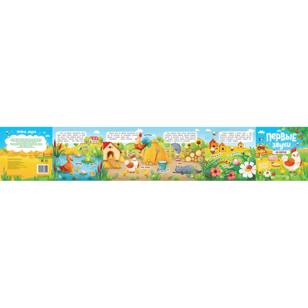 The accordion book "on the farm" will introduce the baby to the weft, pigs, donkey, horse, Turkey and other farm residents. The kid will be able to develop the speech with the help of imitation of the sounds "Ko-Ko-Ko", "kukarek", "pi-pi" and others. The options here are designed to develop the speech of the baby, and therefore conditional and may differ from the sounds that animals produce in reality.