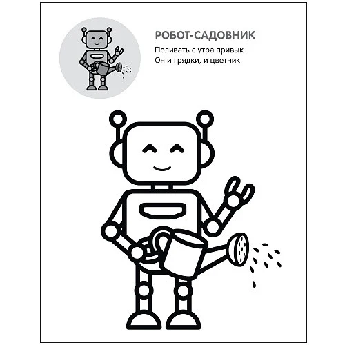 Эта раскраска с наклейками создана специально для самых маленьких художников. В ней малыш найдет 8 симпатичных картинок с толстыми контурами, крупные наклейки-подсказки, которые помогут ему подобрать нужный цвет, а также веселые стихи о роботах, которые могли бы стать нам отличными помощниками в разных делах. Раскрашивая по образцу забавных роботов — повара, садовника и других персонажей, — ребенок весело и с пользой проведет время дома, в гостях, в дороге — где угодно: книжки небольшого формата легко помещаются даже в детский рюкзачок. Занятия с книжками серии «Раскрась по образцу» не только способствуют развитию фантазии, творческих способностей, памяти, внимания и мелкой моторики, но и расширяют кругозор и представления ребенка об окружающем мире.