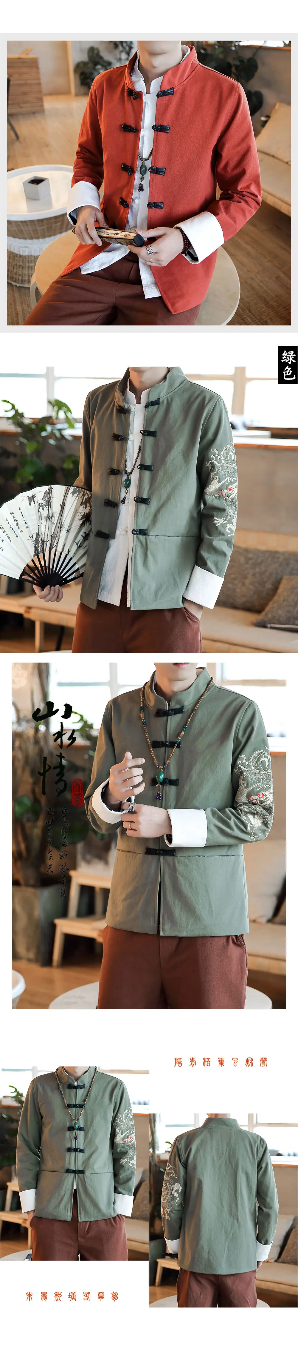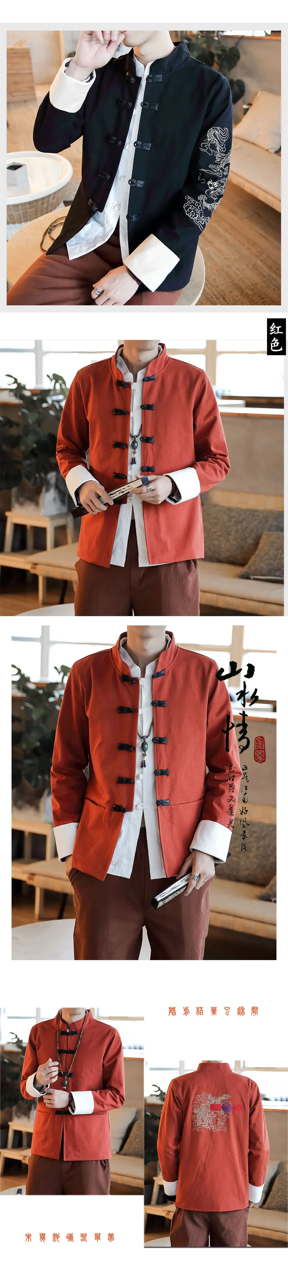 Black Traditional Chinese Collar Shirts For Mens Red Oriental Style Jackets With Dragon Embroidery Ethno Zhongshan Fu Buckle New