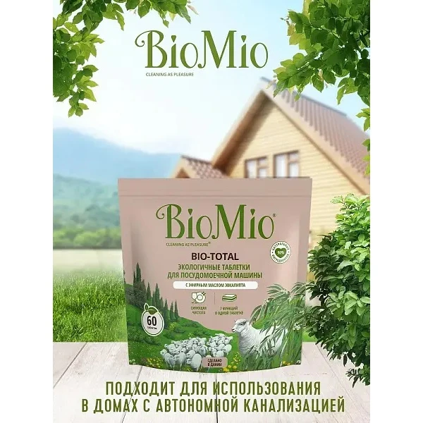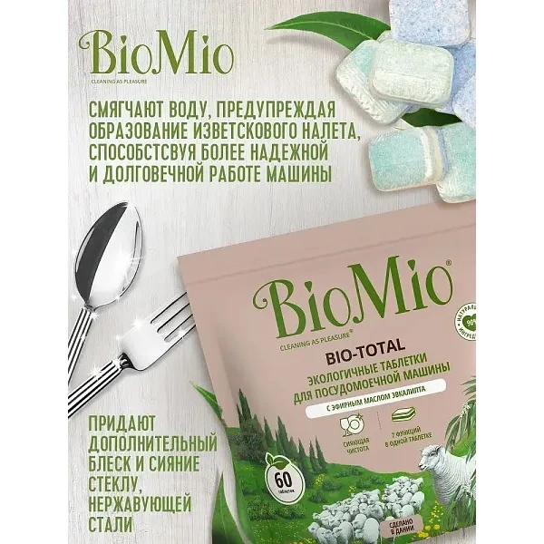 Экологичные таблетки для посудомоечной машины 7-в-1 BIO-TOTAL с эфирным маслом эвкалипта эффективно и деликатно, с заботой о посуде удаляют самые стойкие загрязнения даже при низких температурах, придавая дополнительный блеск и сияние стеклу, нержавующей стали, нейтрализуя запахи. Таблетки быстро растворяются в воде, смягчая ее, тем самум предупреждая образование изветскового налета, способстсвуя более надежной и долговечной работе машины. Не содержат: фосфаты, агрессивные ПАВ, SLES, ЭДТА, ДЭА, хлор, искусственные ароматизаторы. BioMio - линейка эффективных средств для дома, использование которых приносит удовольствие. Продукты, созданные с любовью и заботой, идеально справятся с загрязнениями, оставаясь при этом абсолютно безопасными, экологичными и особенно незаменимыми, если в доме есть малыш. Рекомендации по применению. Промойте сильно загрязненную посуду. Положите 1 таблетку в предусмотренное отделение вашей посудомоечной машины. Выберите соответствующую программу для мытья посуды и запустите машину. Подходит для разных температурных режимов (50-70°С). В регионах с жесткой водой добавьте соль и ополаскиватель в машину.