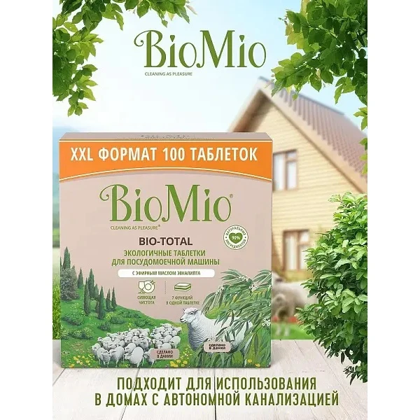 Экологичные таблетки для посудомоечной машины 7-в-1 BIO-TOTAL с эфирным маслом эвкалипта эффективно и деликатно, с заботой о посуде удаляют самые стойкие загрязнения даже при низких температурах, придавая дополнительный блеск и сияние стеклу, нержавующей стали, нейтрализуя запахи. Таблетки быстро растворяются в воде, смягчая ее, тем самум предупреждая образование изветскового налета, способстсвуя более надежной и долговечной работе машины. Не содержит: фосфаты, агрессивные ПАВ, SLES, ЭДТА, ДЭА, хлор, искусственные ароматизаторы. BioMio - линейка эффективных средств для дома, использование которых приносит удовольствие. Продукты, созданные с любовью и заботой, идеально справятся с загрязнениями, оставаясь при этом абсолютно безопасными, экологичными и особенно незаменимыми, если в доме есть малыш. Рекомендации по применению. Промойте сильно загрязненную посуду. Положите 1 таблетку в предусмотренное отделение вашей посудомоечной машины. Выберите соответствующую программу для мытья посуды и запустите машину. Подходит для разных температурных режимов (50-70°С). В регионах с жесткой водой добавьте соль и ополаскиватель в машину.