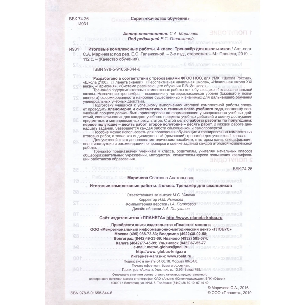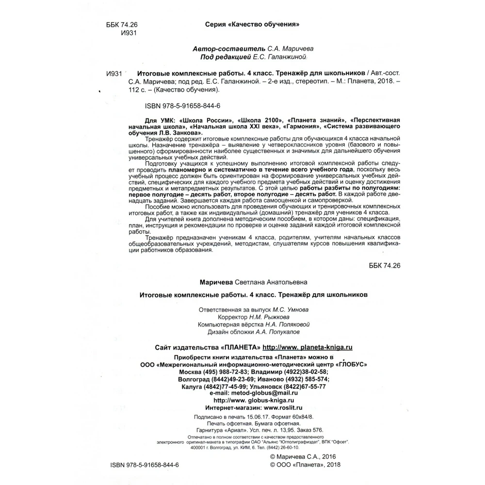 Для УМК: «Школа России», «Школа 2100», «Планета знаний», «Перспективная начальная школа», «Начальная школа XXI века», «Гармония», «Система развивающего обучения Л.В. Занкова». Тетрадь содержит итоговые комплексные работы для обучающихся 4 класса начальной школы. Назначение тетради – выявление у выпускников начальной школы уровня (базового и повышенного) сформированности наиболее существенных и значимых для дальнейшего обучения универсальных учебных действий. Тетрадь может использоваться для проведения обучающих и тренировочных комплексных итоговых работ, а также как индивидуальный (домашний) тренажер для учеников 4 класса. Для учителей тетрадь дополнена методическим пособием, в котором для каждой работы даны: спецификация, план, рекомендации по проверке и оценке, инструкция по проверке и оценке заданий.