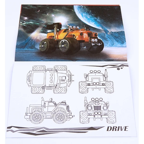 В раскраске на каждом развороте представлена цветная модель Монстр-трака и еще проекционные виды, которые можно раскрасить и воспроизвести с них раскрашенную движущуюся 3D-модель прямо у себя на ладони. А приложении DEVAR kids есть подраздел, переводящий Вашу модель в игру с управлением.