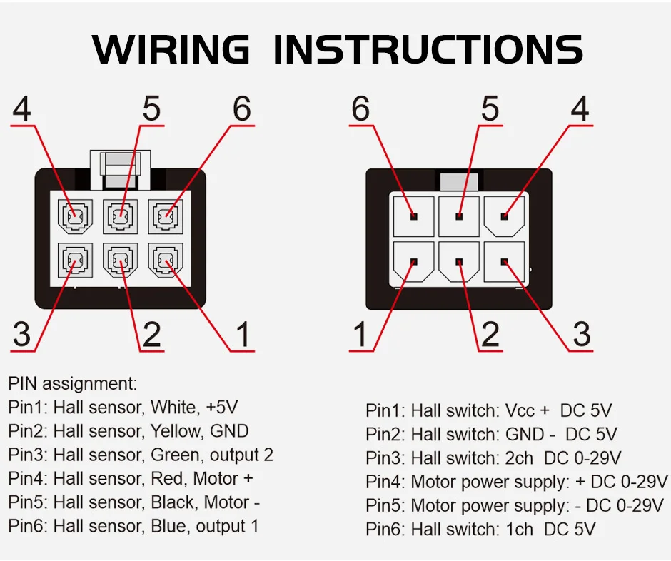 Двигатель с датчиком Холла обычно имеет 6 проводов, то есть 2 провода питания и 4 сигнальных провода