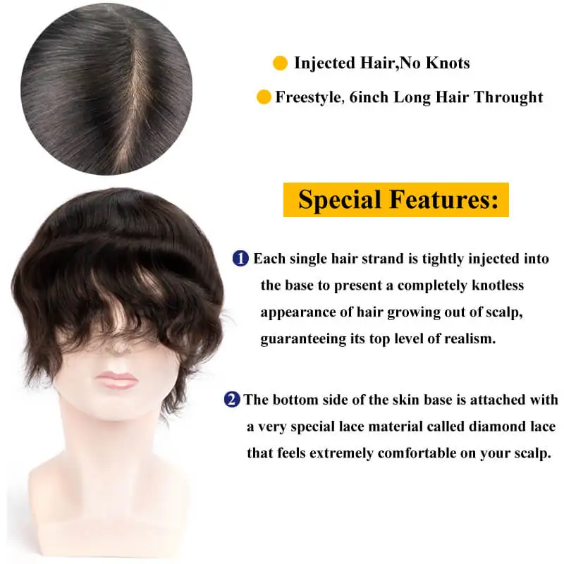 Система для ухода за кожей волос имеет самую естественную линию волос. Волосы на основе имеют v-образную петлю, поэтому они не имеют узелков, сохраняют самый аутентичный внешний вид и легко моются и прикрепляются. Его можно носить и чистить дома. Потому что он очень тонкий, он имеет низкую плотность волос подшипника, поэтому он очень светильник.