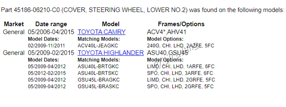 45186-02310-C0:Общее, N. Америка 10/2013-для TOYOTA YARIS NCP15 *,NSP15 *Общее, N. Америка 04/2013-для TOYOTA VIOS, YARIS NCP15 *,NSP15 *Общий 10/2013-для TOYOTA ALTIS, COROLLA NDE170,NZE170,ZRE17 *,ZZE172 45186-06210-C0,45186-06210-E0:Для Toyota premium zrt260 1,8Для Toyota Camry 2010Для Toyota Camry55 2015Для Toyota Camry 40 2008