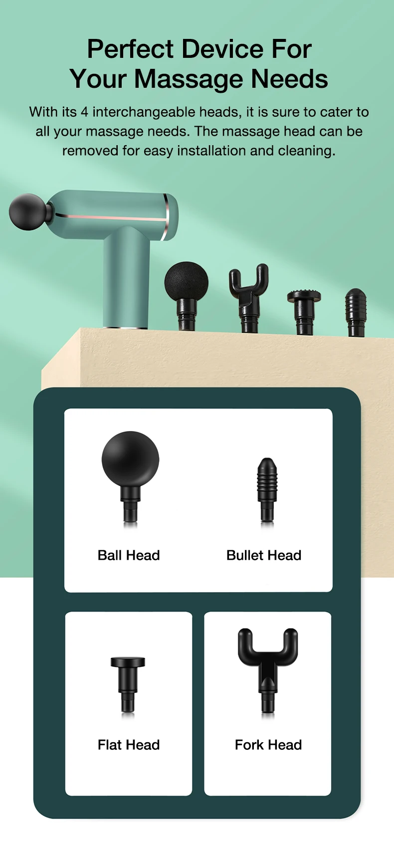 С 4 взаимозаменяемыми головками, он обязательно удовлетворит все ваши потребности в массаже. Массажная головка может быть удалена для легкой установки и очистки.