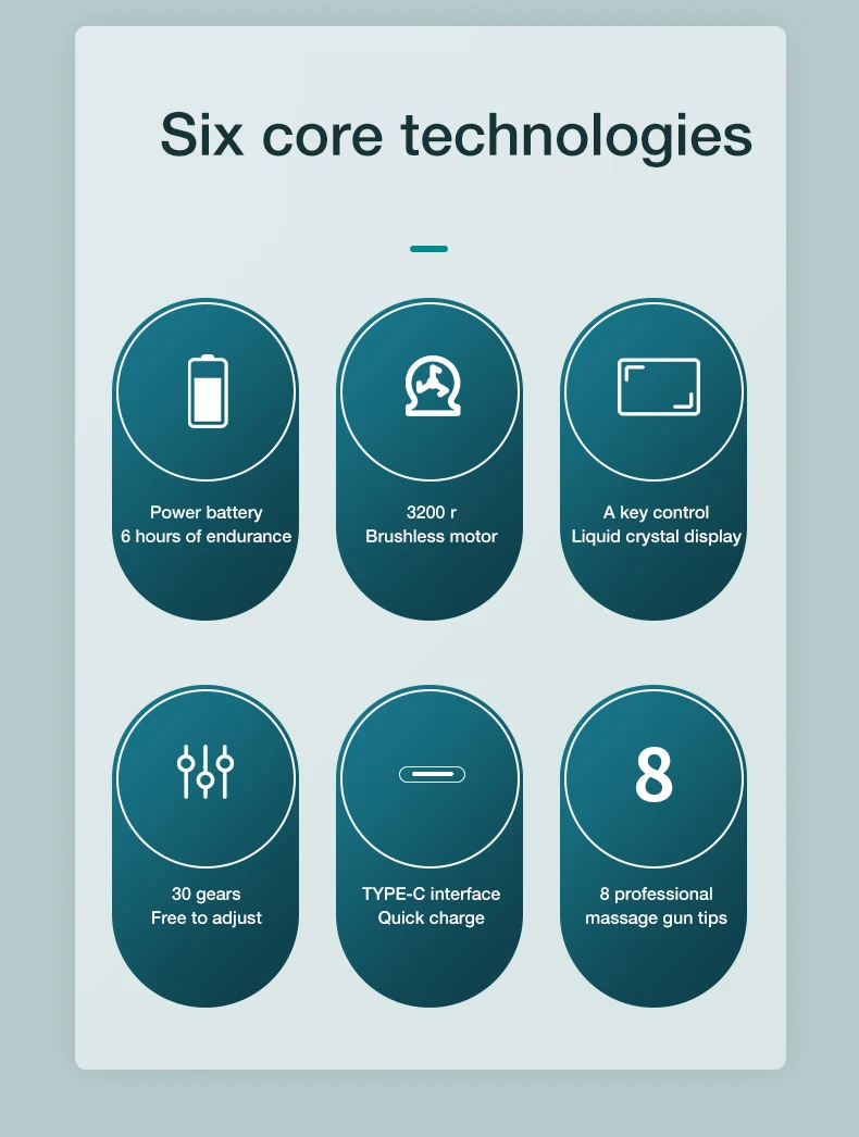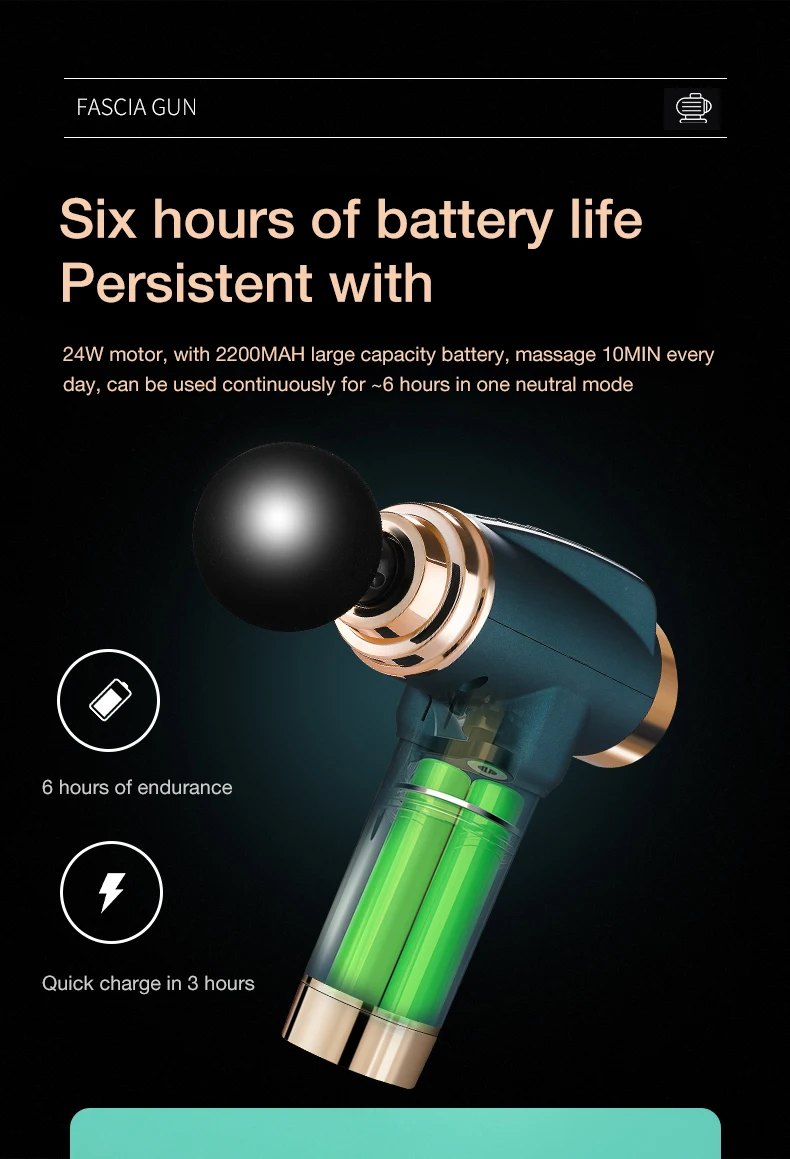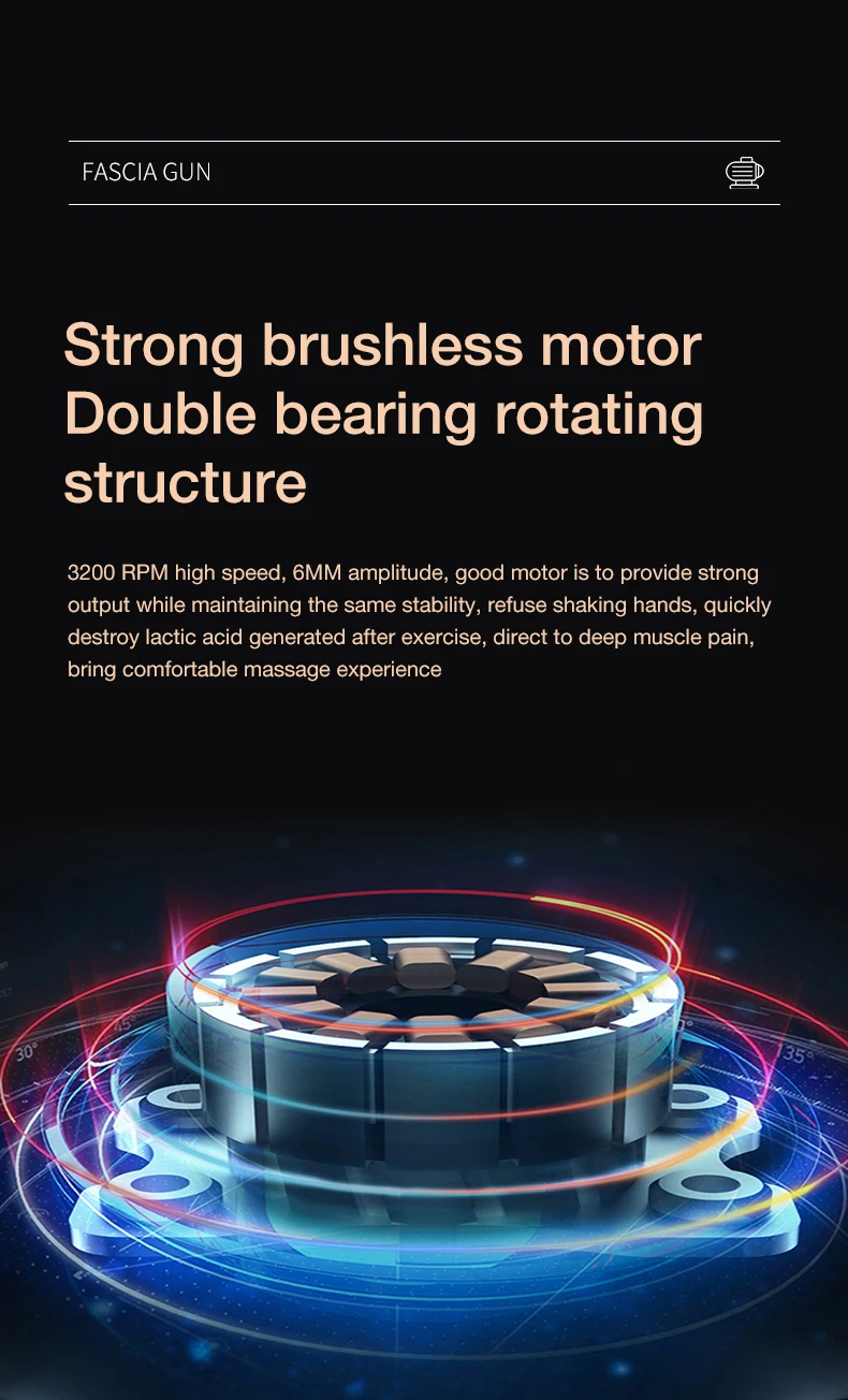 3200 об/мин высокая скорость, 6 мм амплитуда, хороший двигатель, чтобы обеспечить сильную выходную мощность, сохраняя ту же стабильность, отказаться от тряски рук, быстро разрушить молочную кислоту, генерируемую после физических упражнений, непосредственно к глубокой мышечной боли, приятный массаж