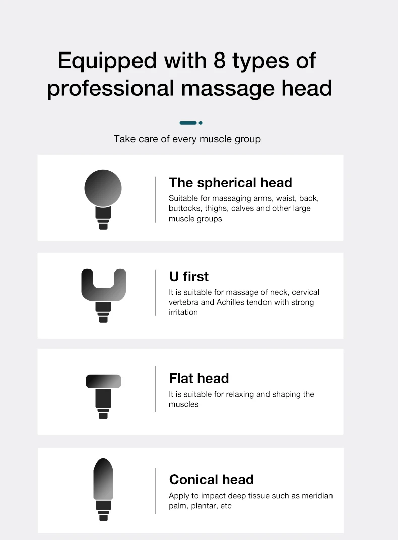 6. Чтобы достичь хорошего эффекта фитнеса и физических упражнений, этот продукт имеет определенную ударную силу, Не ударяйте по голове и суставам. Не рекомендуется использовать пушки фасции для воздействия на слабые мышцы, подмышку, нижнюю часть живота, заднюю ягодицу колена, поясницу, шею и другие части, содержащие важные органы и аорту.