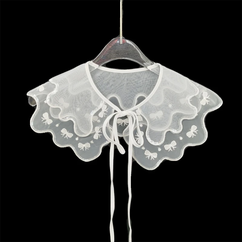 Однотонный белый цвет, многослойный ложный воротник, Вышитый цветочный узор/узор с бантом, волнистая отделка, отделка блестками и бисером.