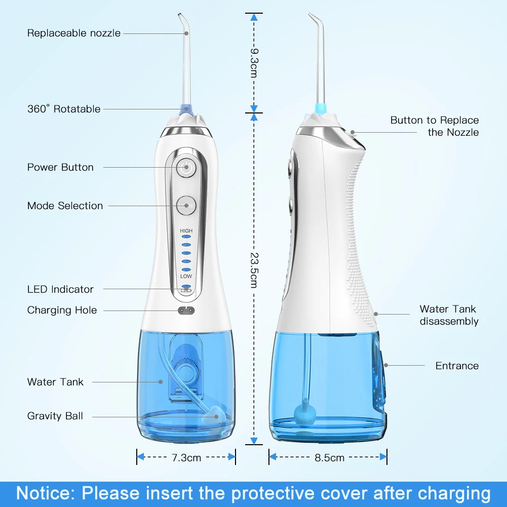 5. Характеристики: многофункциональный/IPX7 двойной водонепроницаемый/5 регулируемых режимов работы/сильное давление воды/удобная портативная USB зарядка/Съемная большая емкость 300 мл резервуар для воды/8 струйных наконечников /Вращающиеся насадки на 360 °/уникальный дизайн гравитационного шара/Водонепроницаемая штепсельная вилка и Пылезащитная штепсельная вилка/автоматическая защита выключения/защита кнопки питания/защита кнопки режима/функция памяти
