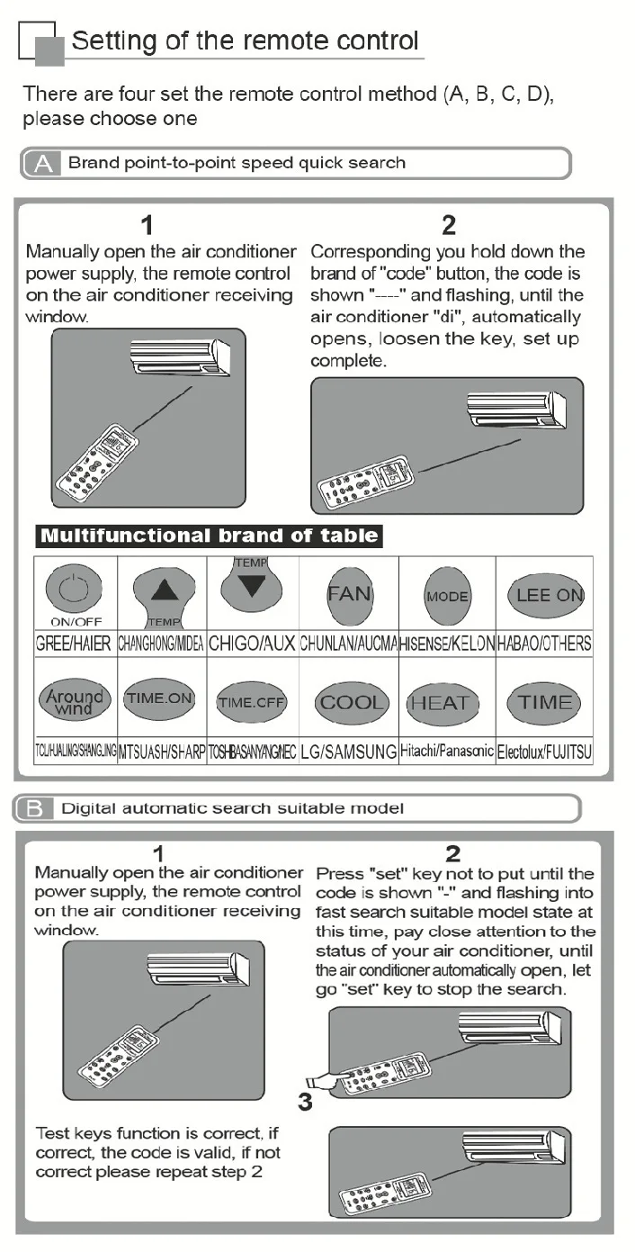 Задняя часть пульта дистанционного управления и инструкции: Нажмите и удерживайте соответствующую кнопку бренда или установите кнопку настройки в левом нижнем углу кондиционера в течение длительного времени. Когда кондиционер включен или выключен, он будет выпущен в течение одной секунды (если функция не вверх, установите ее снова). После настройки он будет таким же чувствительным, как и оригинальный пульт дистанционного управления.