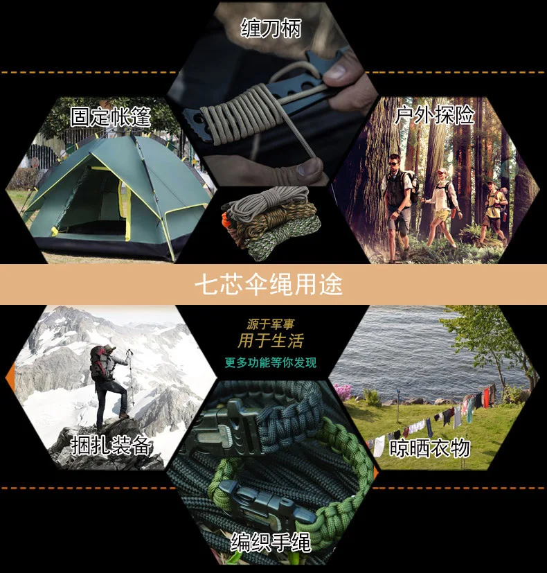Оборудование для лесозаготовки, верёвки для палатки и т. Д., может использоваться для остановки кровотечения, трейлеров, оказания первой помощи, обвязки временных палаток при выживании в пустыне, обмотки рукоятки ножа, ручки, качающиеся хвостовые веревки, nunchaku соединительные веревки, Рогатка лук веревки, и поле связывания оборудования, палатка шнурок, И т. Д. Используются все специальные зонтичные канаты, которые такие же, как канаты, используемые в морских сосудов, и имеют преимущества коррозионной стойкости и устойчивости к старению.