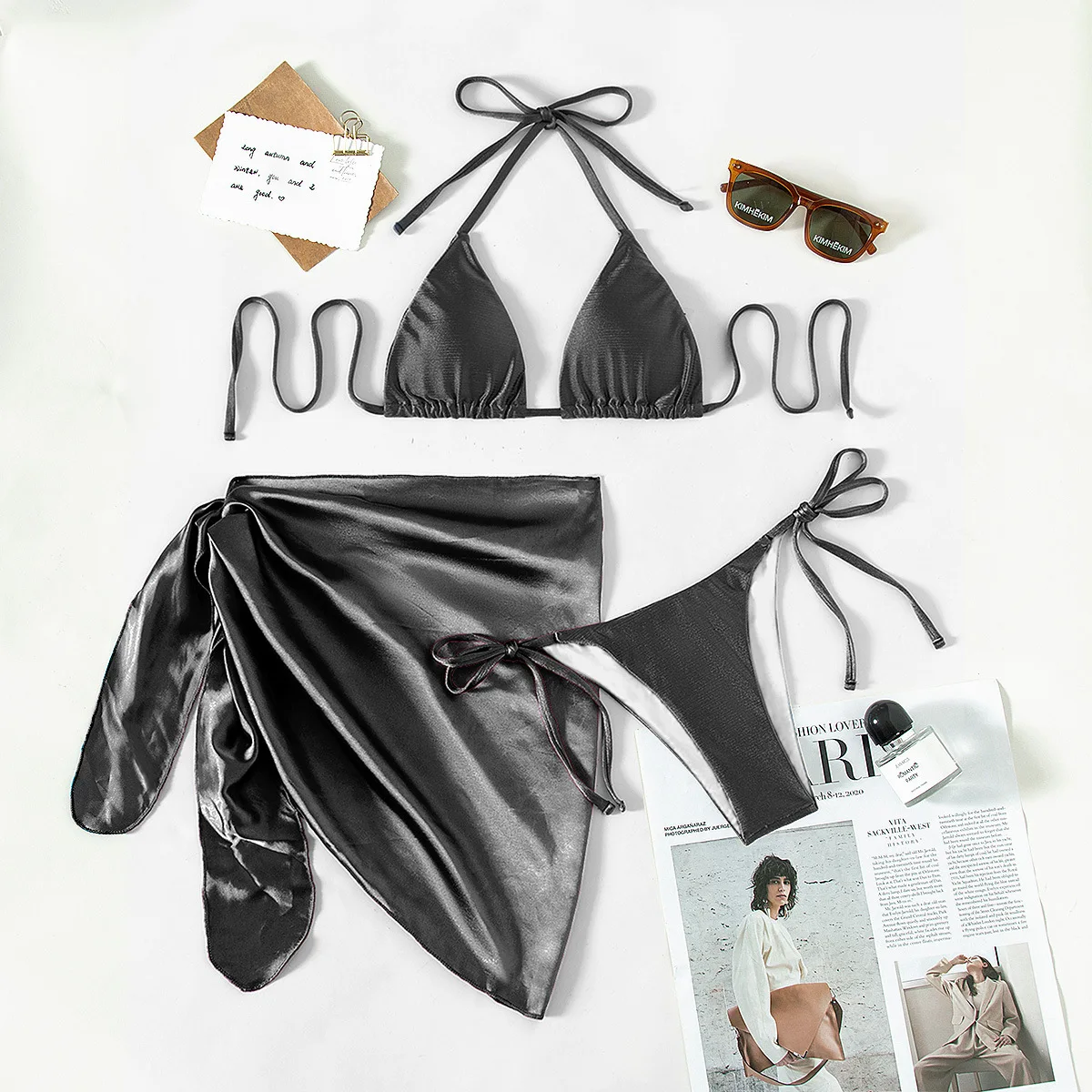 Костюм из 3 предметов (1 топ с подкладкой + 1 низ + 1 саронг из атласной ткани)