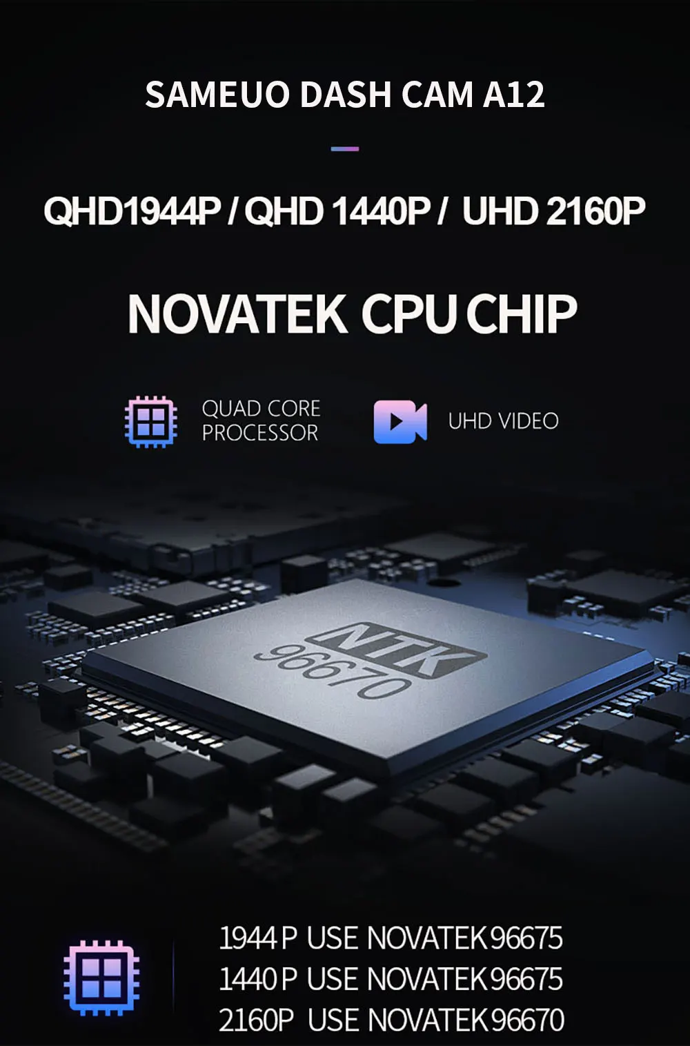 На основе мощного Novatek 96675/96670CPU, объектив одновременно захватывает спереди и внутри на 1440P 30F/P и 1944P 30F/P и 2160P 30F/P
