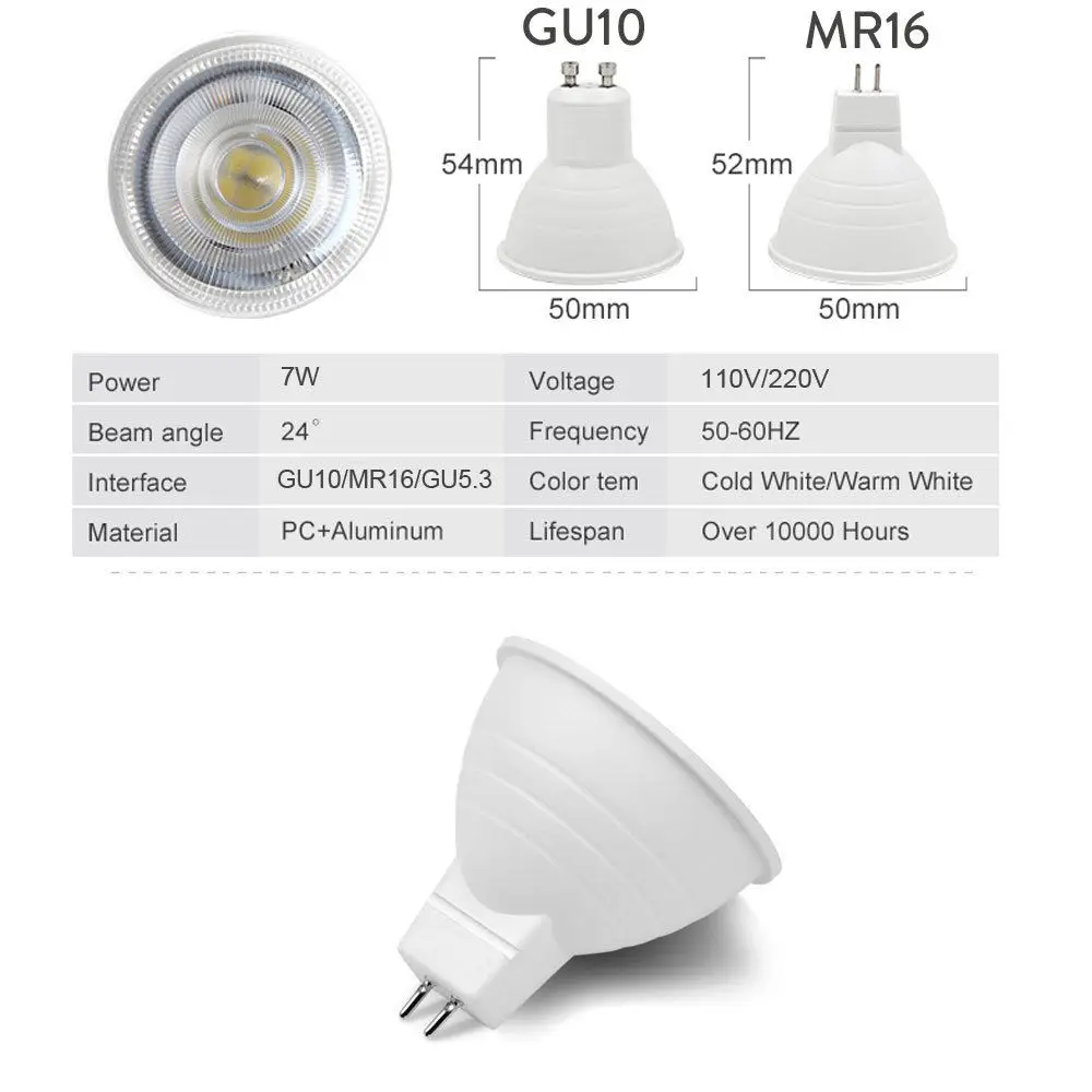 Тип: GU10/GU5.3/mr16 мощность: 7 Вт Напряжение: AC 110 В, AC 220 В диммируемая или нет: диммируемая (110 В/220 В); Не диммируемая (110 В/220 В) красный, зеленый, синий) Угол пучка: 24 DegreeCertification: от производителя (Сертификация CE & ROHSLifespan: Более 100000 HrsWarranty: 3 года
