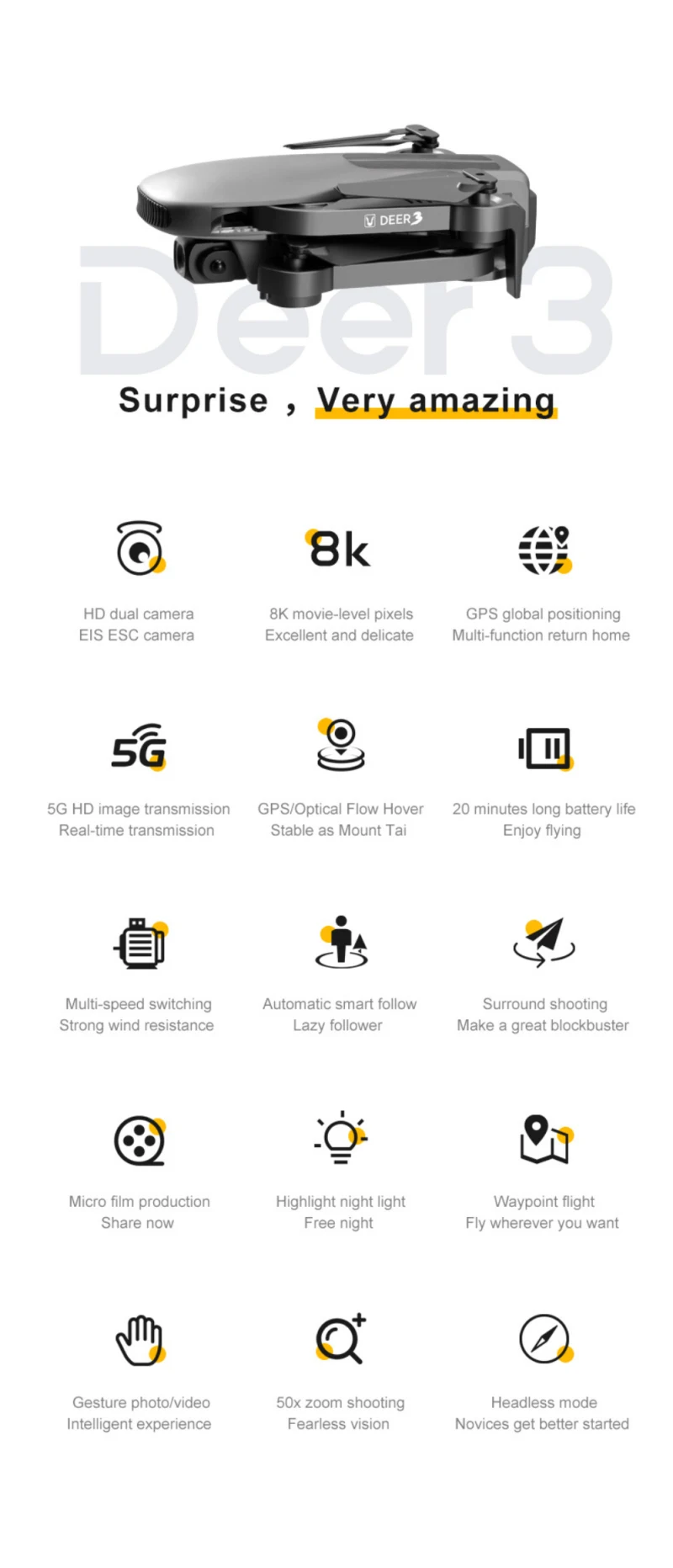 Особенности: 8K из нержавеющей стали с электронным управлением камеры, 25 минутах время работы от аккумулятора, GPS интеллигентая (ый) позиционирования, фиксированный точечный зависание/летать в помещении и на открытом воздухе, "Умный" блок управления, 360 градусов по кругу, интеллектуальное управление полетом, Безголовый режим, одно-кнопочное снятие/посадка, 5G передача изображения высокой четкости, жестовая фотография/видеозапись, креативное производство мВ, интеллектуальное управление приложениями, многоступенчатое управление, И складной фюзеляж.