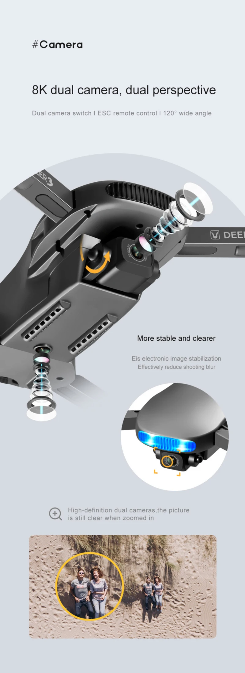 Увеличьте расстояние до 50X, чтобы четко видеть расстояние, и технология Eis electronic anti-shake более стабильная и четкая, что может эффективно уменьшить размытие съемки. С двумя камерами высокой четкости, увеличение изображения по-прежнему ясно.