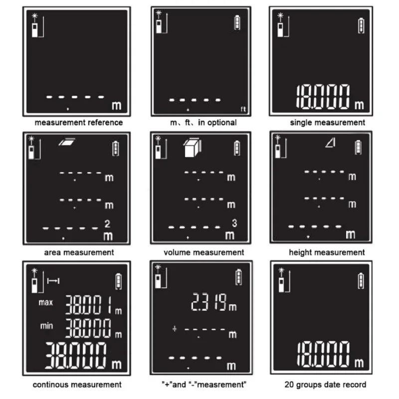 ✔Измерение площади.Позволяет измерить площадь любых прямоугольных поверхностей. Для этого достаточно двух измерений, сделанных в перпендикулярных направлениях, тогда устройство автоматически умножит полученные данные.