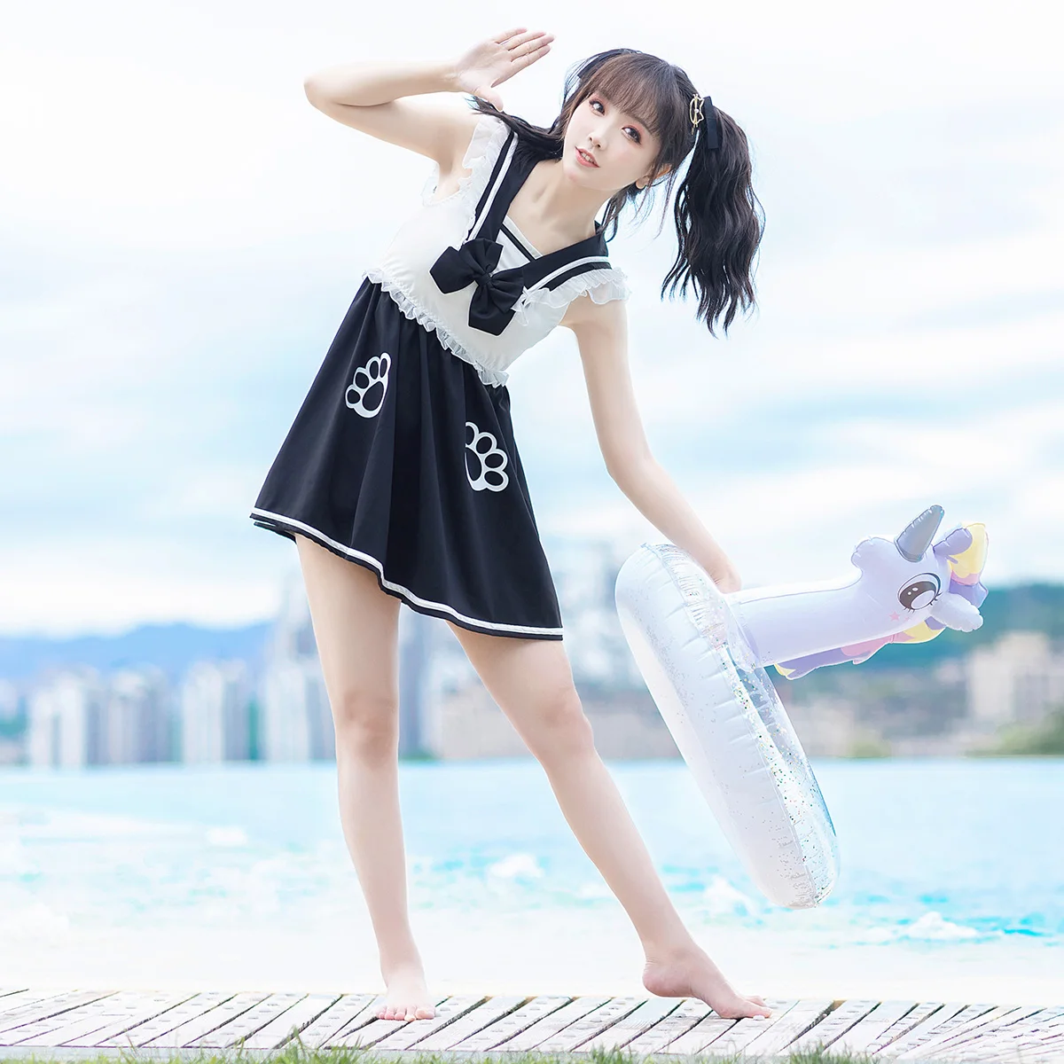 Material: swimsuit fabric, mesh fabric Set: 1x dress 1x pants Size M, skirt length 73cm, bust 72-106cm, high waist 60-88cm, swimming trunks waist 62-114cm, pants length 21cm, crotch depth 26cm, recommended weight 40-52.5kg Size L, skirt length 75cm, bust 76-110cm, high waist 64-92cm, swimming trunks waist 66-120cm, pants length 22 m, crotch depth 27cm, recommended weight 52.5-60kg