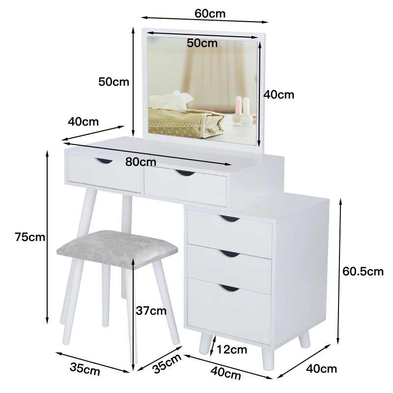 Размер изделия: 80*40*125 смРазмер упаковки: 88*48*25 смВес брутто: 27 кг[Высокое качество]:❤Этот туалетный столик изготовлен из ДСП Класса E1 (15 мм), который является водонепроницаемым и устойчивым к истиранию, царапинам и деформации. Удобный PU стул, ноги schima superba имеют очень сильную стабильность и хорошую грузоподъемность.[Большое пространство для хранения]:❤Есть 5 ящиков, которые могут обеспечить достаточно места для хранения косметики, ювелирных изделий, украшений и парикмахерских приборов и других аксессуаров туалетного столика. Туалетный столик поможет вам сохранить вашу косметику в порядке.[Многофункциональность]:❤Этот туалетный столик можно использовать не только как туалетный столик, но и как настольный столик. Шкаф рядом с ним также может использоваться как прикроватный столик, чтобы украсить ваш дом. Вы можете поместить его в спальню, гостиную, студию, Свадебный магазин и т. д.[Антидемпинговое устройство]:❤Мы добавили антидемпинговое устройство, чтобы сделать туалетный столик более стабильным. Благодаря скользящей поверхности туалетный столик очень легко моется.[Информация о продукте]:❤Размер таблицы: около 80x40x75 см;Размер зеркала: около 60x50 см;Размер стула: около 35x35x37 см;Прикроватный столик: около 40x40x60,5 см;Вес стула: 100 кг.