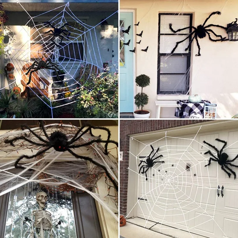 Гигантская паутина пауков сделана из толстых и твёрдых струн, которые так пушистые, что делает паутину абсолютно настоящей! Все ноги пауков могут быть согнуты, что вам нравится. Реалистичный поддельный паук с черными волосами, красные глаза, которые выглядят реальными.