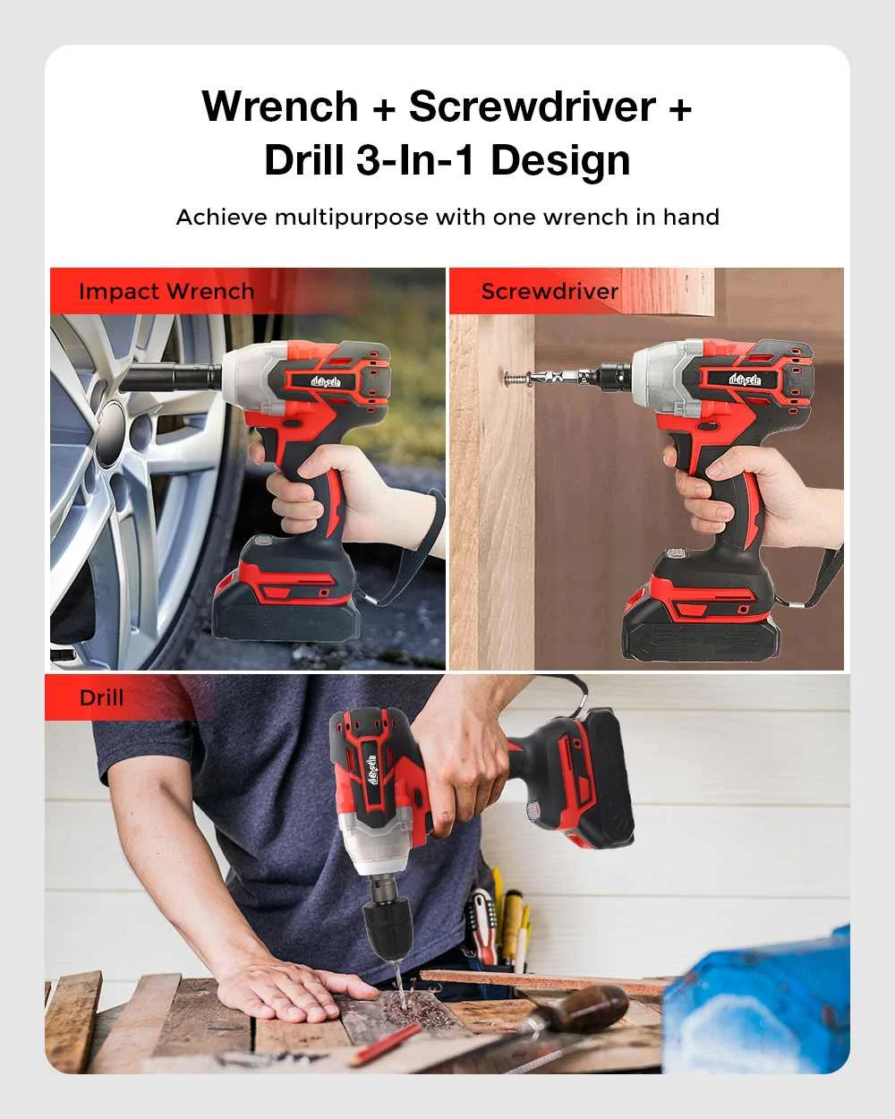 Function: Wrench + Screwdriver + Drill 3-in-1 Design