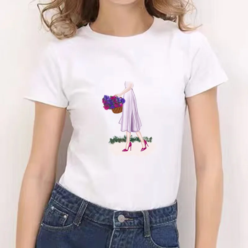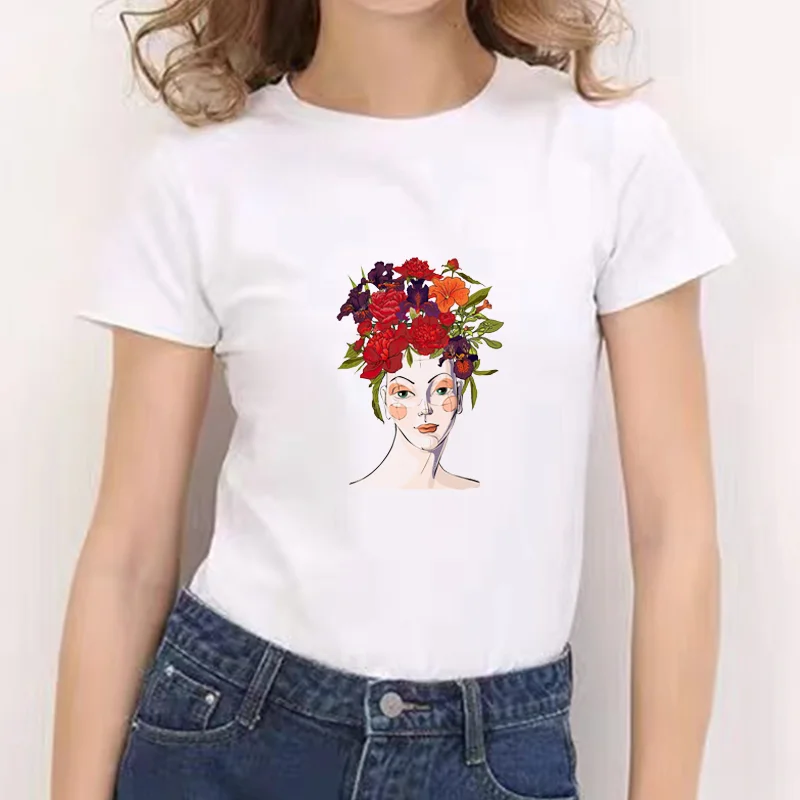 Новинка 2021 года; Белые футболки с цветочным принтом для девочек; Женские базовые повседневные футболки; 90s; Недорогие повседневные футболки с круглым вырезом и короткими рукавами