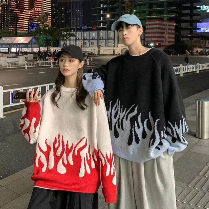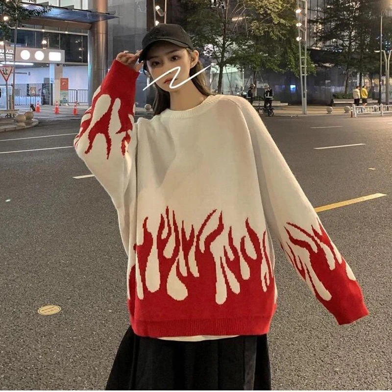 2021 Весенний новый свободный свитер с круглым вырезом, Женский жаккардовый свитер с пламенем, цветная Свободная верхняя одежда, красный свитер для пар