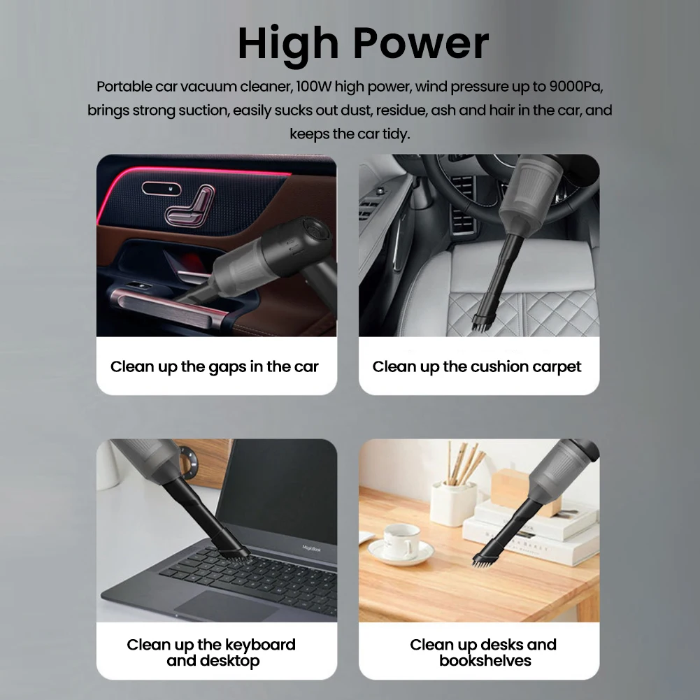 Высокая мощность:Портативный автомобильный пылесос, высокая мощность 100 Вт, давление ветра до 9000 па, обеспечивает сильное всасывание, легко высасывает пыль, остатки, золу и волосы в машине, и держит автомобиль аккуратным.