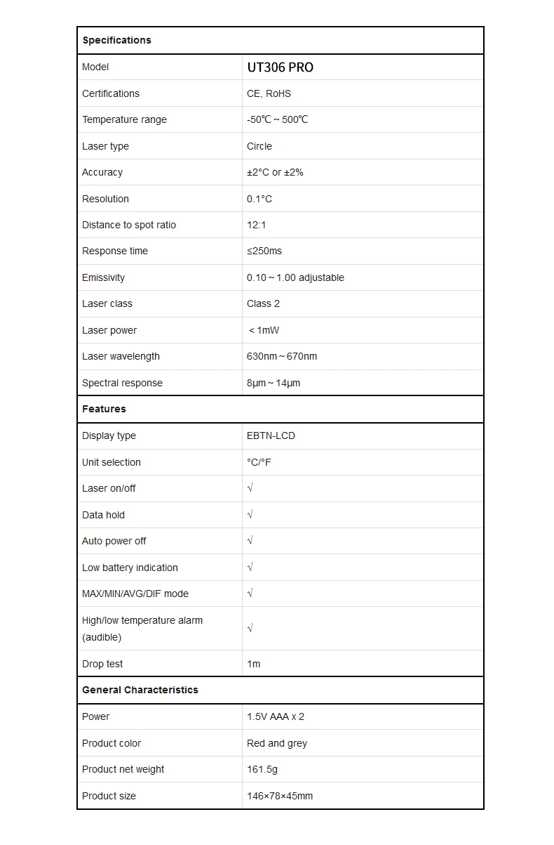 UT306 PRO является надежным и простым в использовании. Пользователи могут измерить температуру поверхности, не связавшись с объектом. Эта серия продуктов может использоваться в различных областях, таких как пищевая промышленность, техническое обслуживание машины, металлообработка, холодное хранение и другие промышленные области.