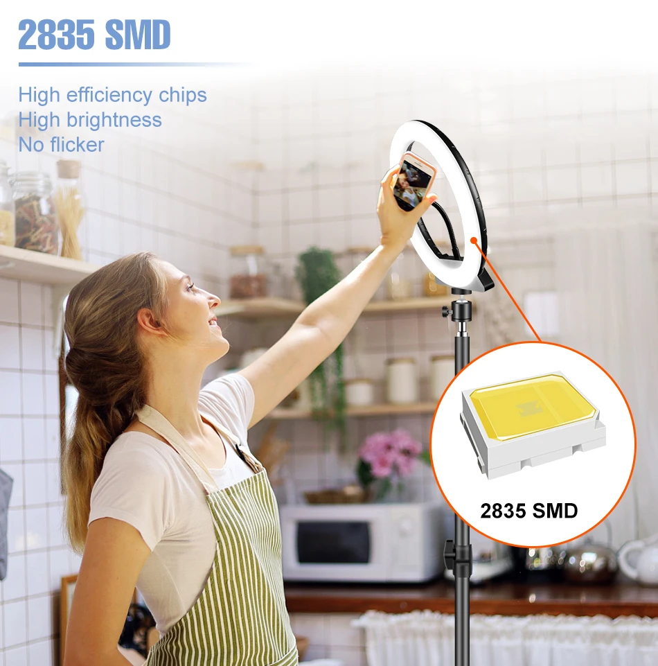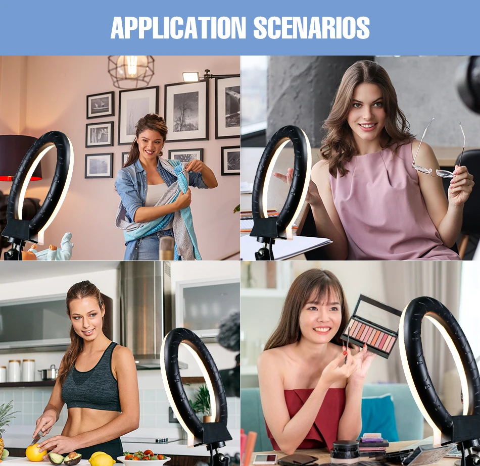 Наш светодиодный кольцевой светильник для селфи широко применяется в наружном фото-светильник, макияж, видео в реальном времени, студийный светильник, видео Крытый заполняющий светильник, прямая трансляция, креативные короткие, портретные, модные, продукт/реклама фотография, запись видео, прямой светильник заполняет красоту, и т. Д.