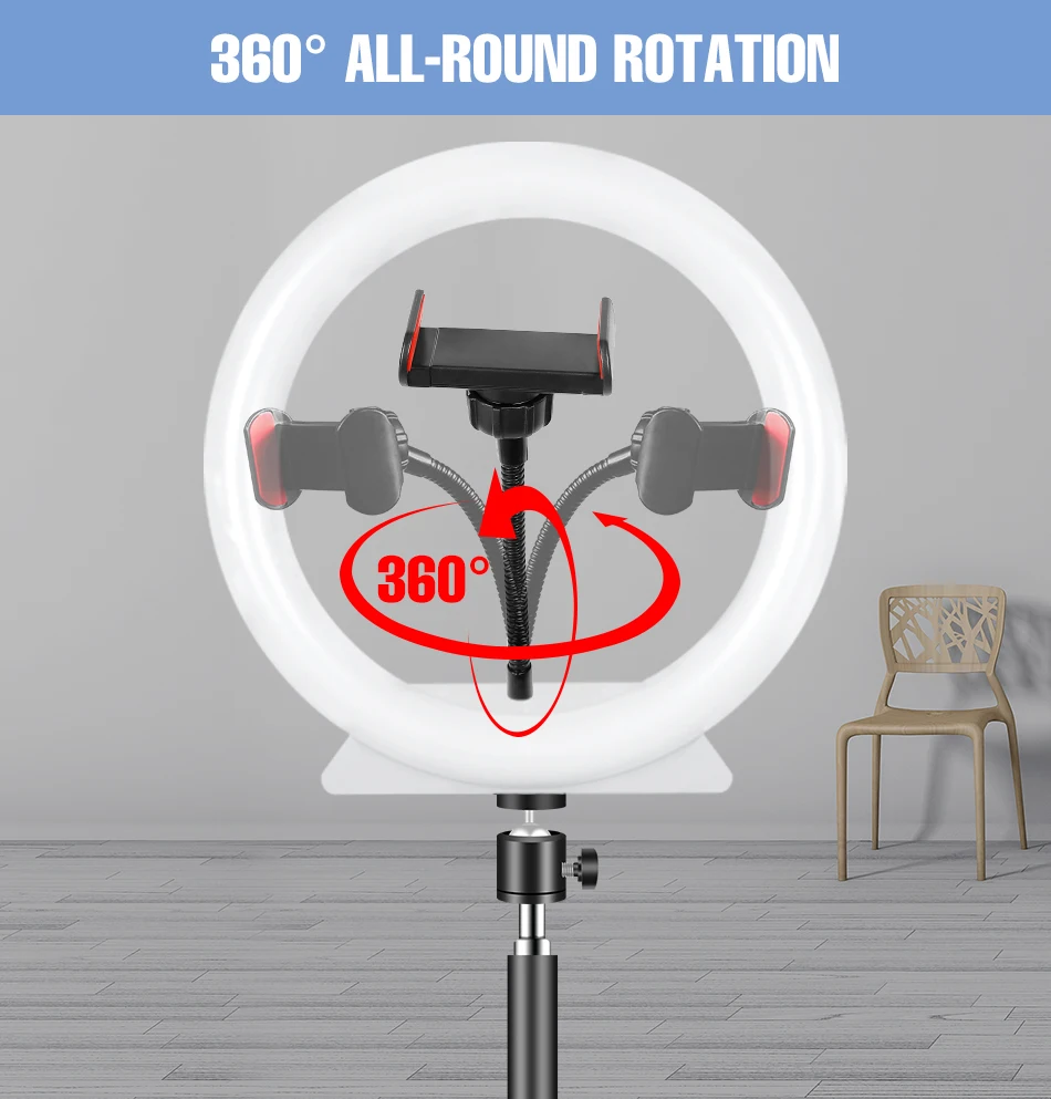 * Вращение:Светодиодный кольцевой светильник можно установить на кронштейн и взять в любом месте, его также можно снять с кронштейна в любое время, шаровая Головка штатива может вращаться на 360 градусов для регулировки под любым углом (кронштейн не входит в комплект).