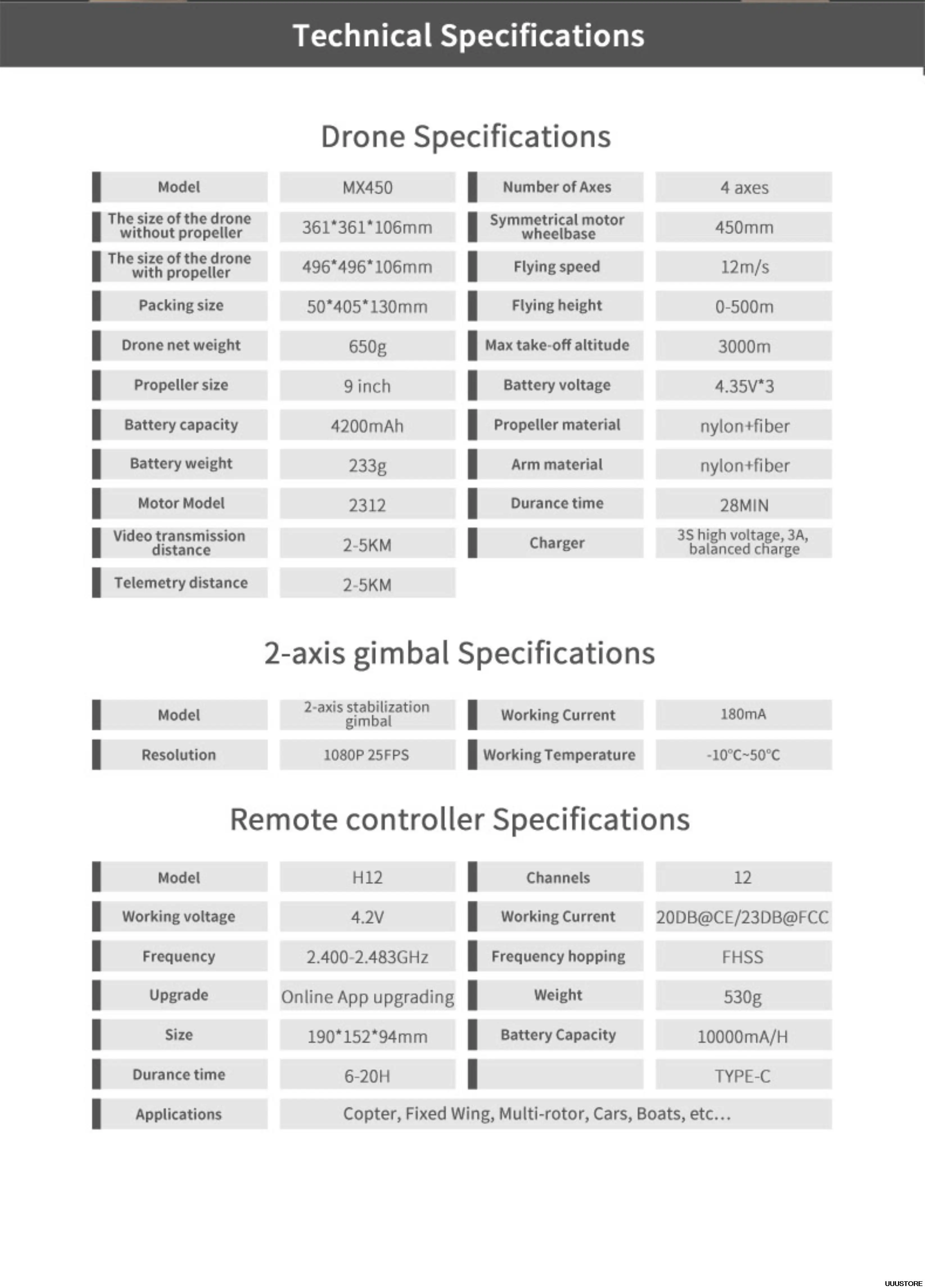 Введение: новое поколение многофункциональной версии Skydroid MX450-это протокол с открытым исходным кодом, высокая интенсивность, высокая точность, продолжительность работы 28 минут, цифровая передача видео 5 км, на основе угла обзора FPV, камеры 1080p HD без искажений и других конфигураций, полностью модернизированы, добавив функции бросок, освещения и рекламы.